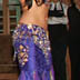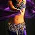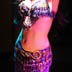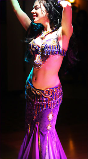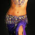This bellydance costume is custom-made in Istanbul by Bella. It is a deep blue-purple with gold accents and rhinestones. The stretch velvet skirt is fitted to the knee with chiffon inserts and an opening over the left leg. There are diamond cut-outs along the left side of the skirt and a scroll-work cut-out over the right thigh. The design is identical to the silver costume I sold earlier. I have 5 costumes in this design and I love them all. They make a skinny girl look amazingly curvy. The costume is in good condition with no broken fringe or bead loss.