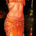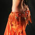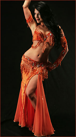 This bellydance costume was custom-made for me in Istanbul by Bella. It is orange stretch velvet with crystal and gold accents. A large, open cut-out over the right thigh shows most of the upper leg. The skirt is fitten through the hips but flares at the bottom, with a slit over the left leg. The gloves are mostly open, with a diamond motif connecting the upper arm band to the wrist cuff.