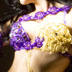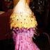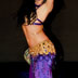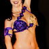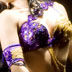 The costume is covered in stones - purple stons on the gold lycra and gold stones on the purple lycra. The gold and purple fabric on the skirt are separated by a row of purple sequined flowers, with swags of fringe hanging from the flowers. The flowers are echoed on the cross-strap on the bra, and on the arm band and both wrist cuffs. The color combination is gorgeous. I wore it for New Years Eve this year. You can see the costume on my latest performance video here: