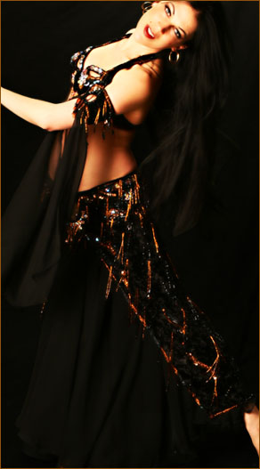 This is a custom made Bella costume direct from Istanbul, Turkey. I'm selling it because my hips aren't big enough to feel comfortable without wearing a belt. Every few years I try orderinng an egypitan sytle, belt/skirt/combo costume, and every time I end up selling it. The Bra has a vest design with the velvet wrapping under the bust and the straps around the neck. The skirt is a straight velvet skirt gatthering to the front circle with a black chiffon insert in the front center hanging from the circle.