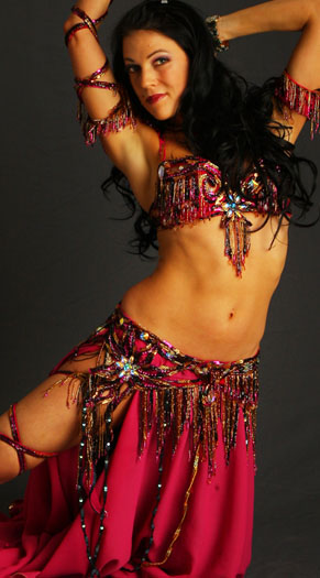 This costume was custom made for me by Bella in Istanbul. There are two skirts. one of which i don't have photos of. it's a flared skirt with an opening in the front - it's fuchsia crushed velvet, with a big cutout over the hip, that lines up with the cutouts around the flower on the belt. All the dangles are attatched to the belt, so they go with both skirts. The leg lacings are attatched to the flower with hooks, so they are removable depending on which skirt you wear.