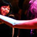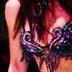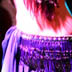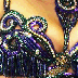This bellydance costume is custom-made in Istanbul by Bella. It has scroll work with cut-outs over the bra and belt - the skirt is a double chiffon circle skirt with sequins along the hem and starburt sequined patterns along the bottom of the skirt. The color scheme is teal and pruple - it was supposed to look peacock-ish, but i think it turned out more 'classic mardi gra'. Either way, it's a great costume with lots of cut outs and the beaded fringe is in good, but not perfect, condition. I wear it practically every weekend - it's just a good basic costume for a costume wardrobe. The front of the belt is heavily decorated, while the back of the belt, as you can see in the bottom right photo, is mainly just fringe.