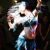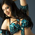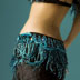 This costume was custom-made for me by Bella in Istanbul. It is black velvet with turquoise and crystal accents. The skirt is a fitted mermaid cut with an opening over the left leg. The right thigh has a scrolling cutout, filled in with flesh-toned mesh and crystals. It's a bit heavier that most of Bella's costumes. There is really a lot of fringe on the belt - about twice as much as the usual bra and belt set.